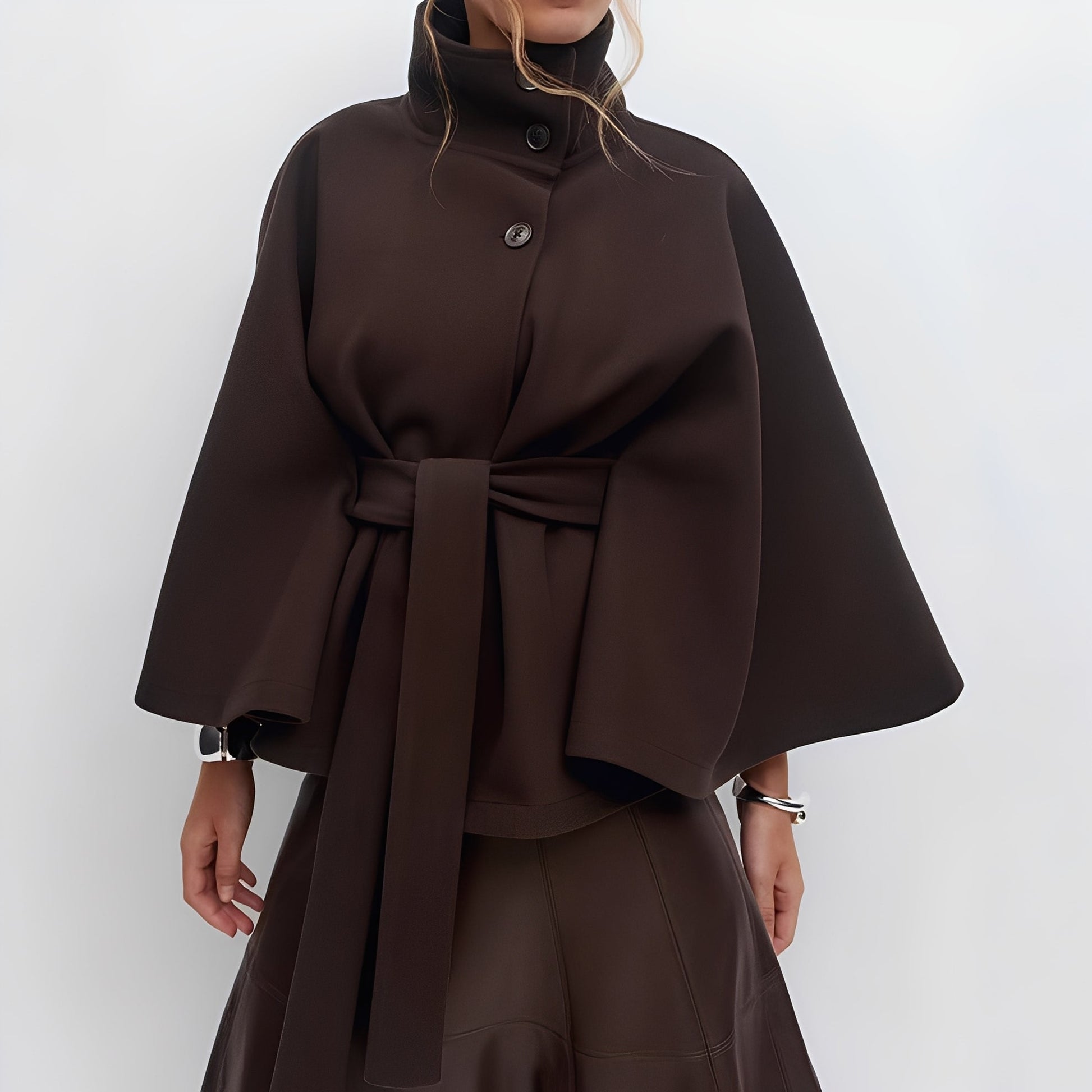 - Eleganter hoher Kragen und weite Ärmel, die Ihrem Stil mühelos Ausdruck verleihen