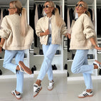 Die „Carmen“-Bomberjacke kombiniert zeitlose Streetwear-Ästhetik mit modernen Details. Dank des lockeren Schnitts und der weichen Materialien bietet sie optimalen Komfort – ideal für die Übergangszeit oder kühle Sommerabende. Die Seitentaschen sorgen für praktischen Stauraum, während die elastischen Rippbündchen an Ärmeln und Saum für eine perfekte Passform sorgen. Ob casual oder sportlich – diese Jacke passt sich Ihrem Look an.