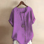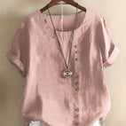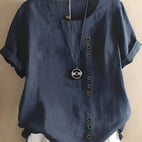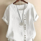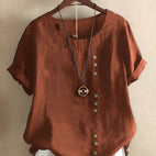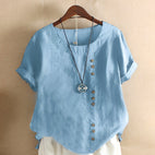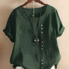 Schickes Design: Die modische Kurzarmbluse hat vorne Knöpfe und einen klassischen Rundhalsausschnitt, der Eleganz und zeitlosen Stil verkörpert und für verschiedene Anlässe geeignet ist.