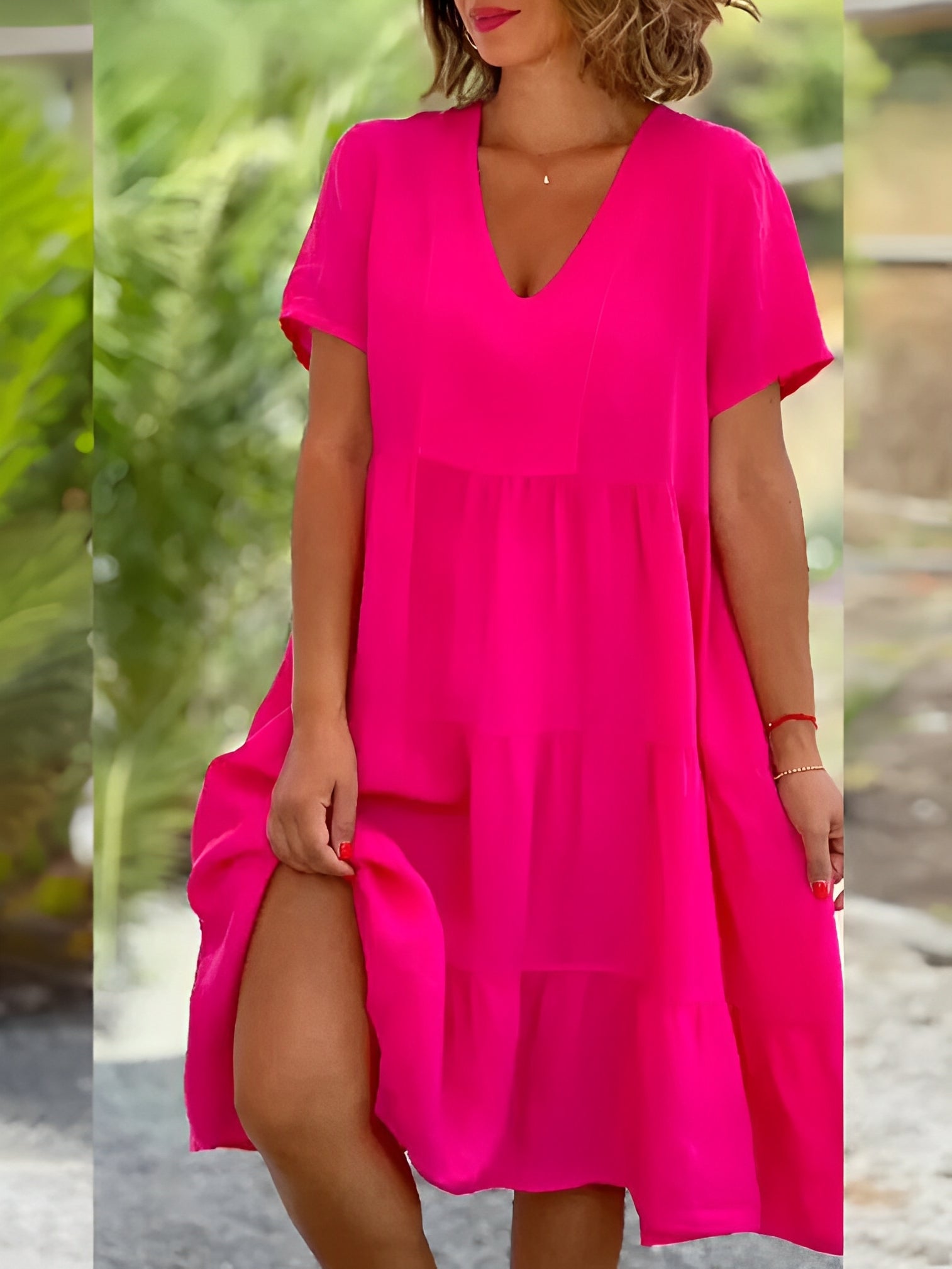 Das Ethelinda – Fließendes Kleid mit V-Ausschnitt besticht durch seine feminine Silhouette und seinen luftigen Schnitt. Der schmeichelhafte V-Ausschnitt sorgt für eine elegante Note, während das weiche, fließende Material angenehm auf der Haut liegt. Ideal für sonnige Tage, Sommerfeste oder entspannte Spaziergänge – dieses Kleid ist ein echtes Highlight für Ihre Garderobe. Die lockere Passform bietet Bewegungsfreiheit und sorgt gleichzeitig für einen stilvollen Auftritt. Einfach kombinieren und wohlfühlen – das perfekte Sommerkleid.