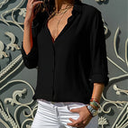 Das Damen-Langarmshirt ist elegant und bequem dank seines weichen, luftigen Stoffs, des entspannten Schnitts, des Kragens, der Knöpfe vorne und der langen Ärmel. Es hebt Ihre charmante Figur hervor und Sie werden sich großartig fühlen, wenn Sie es tragen. Viele werden Ihr tägliches Outfit bewundern.