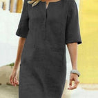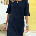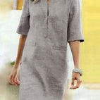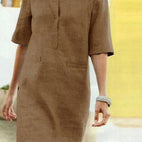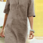 Einfach, stilvoll und angenehm – Rieke ist das Kleid für alle, die schlichte Eleganz lieben. Gefertigt aus einer atmungsaktiven Baumwoll-Leinen-Mischung, bietet dieses knielange Shiftkleid eine lockere Passform und einen modernen V-Schlitz-Ausschnitt. Die halblangen Ärmel und die dekorativen Taschenklappen runden den Look ab und machen Rieke zum perfekten Begleiter für Alltag, Büro oder Freizeit.